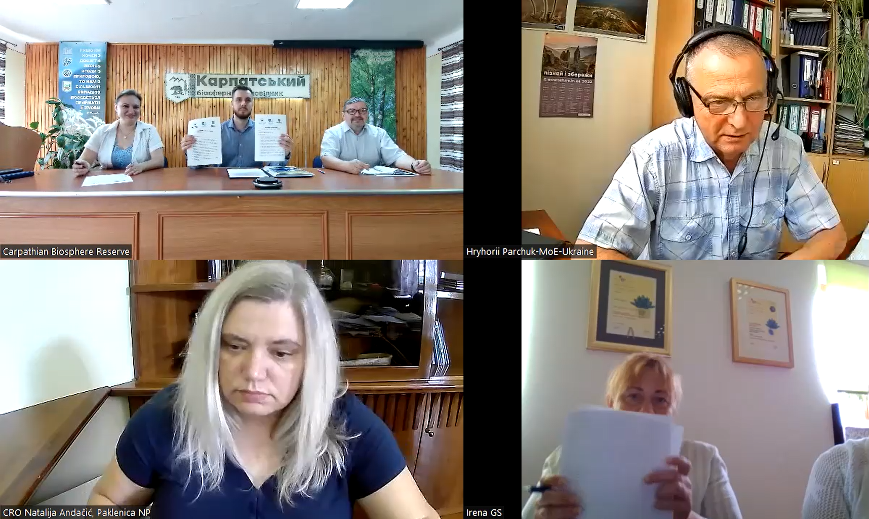 8 червня 2022 р. відбулася онлайн-зустріч за участі керівництва трьох природоохоронних територій, а саме Карпатського біосферного заповідника і національних парків «Пакленіца» і «Північний Велебіт» (обидва Хорватія). Нашу установу на зустрічі представляли директор Микола Тарасюк та автори цих рядків. Також в онлайн-заході участь брав начальник відділу Департаменту природно-заповідного фонду і земельних ресурсів Міндовкілля Григорій Парчук. Метою зустрічі було підписання Меморандумів про співпрацю між зазначеними вище природоохоронними територіями. Справа в тому, що в грудні 2021 р. у Києві відбулося 2-ге засідання Спільної комісії з питань економічного співробітництва між Урядом України та Урядом Республіки Хорватії, під час якого прийнято низку важливих рішень. Ці рішення стосувалися й розширення співпраці у галузі охорони природи. Саме з метою виконання домовленостей, досягнутих на цьому засіданні Спільної комісії, адміністрація КБЗ звернулися до хорватських партнерів з відповідною ініціативою. Важливо зазначити, що підписання Меморандумів не тільки сприятиме розвитку співпраці між нашими установами, але й поступом у поглибленні зв’язків між урядами України та Хорватії.