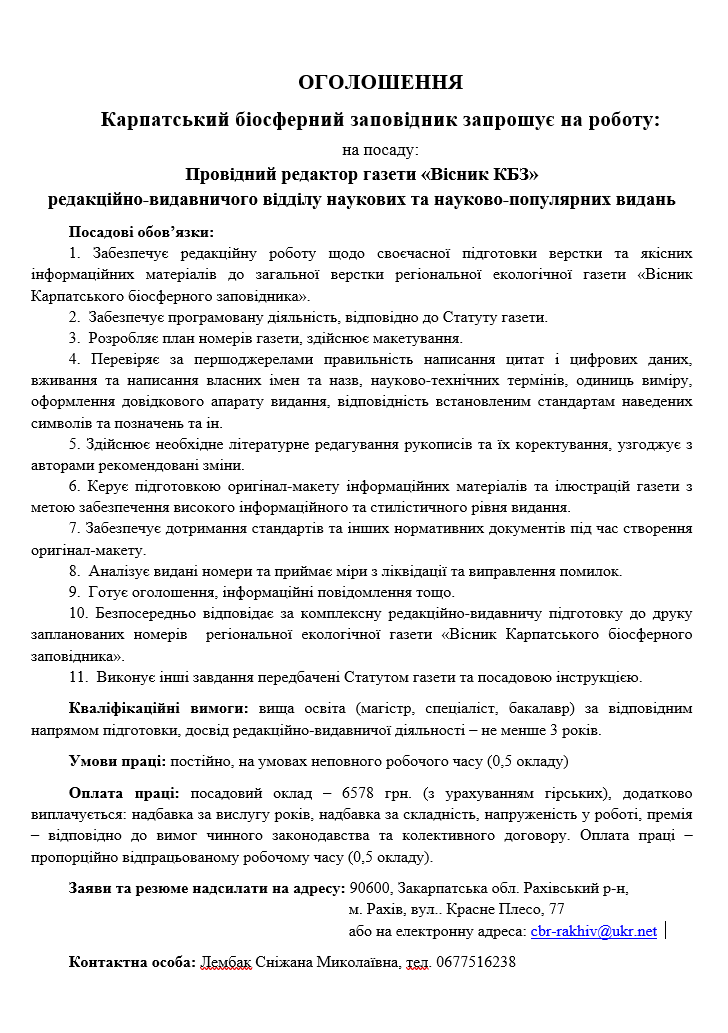 Заяви та резюме надсилати на адресу: 90600, Закарпатська обл. Рахівський р-н,