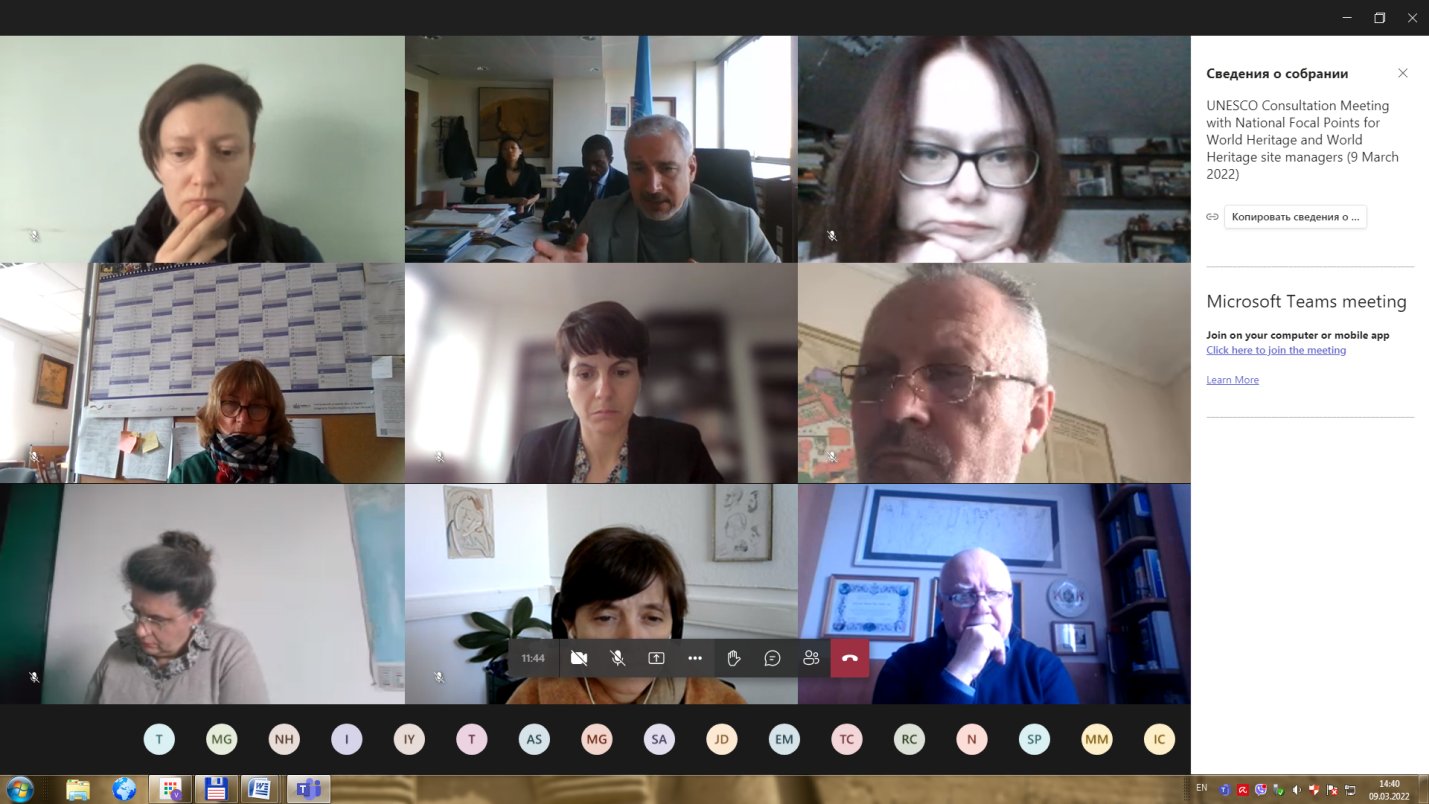 Культурний сектор Центру Всесвітньої Спадщини 9 березня організував консультаційну онлайн-зустріч із представниками об’єктів всесвітньої спадщини ЮНЕСКО в Україні. Метою зустрічі був збір оперативної інформації щодо поточного стану об’єктів спадщини, наявних загроз і небезпек у контексті російської агресії, а також напрацювання плану дій та обговорення наступних кроків для забезпечення належної їх охорони.